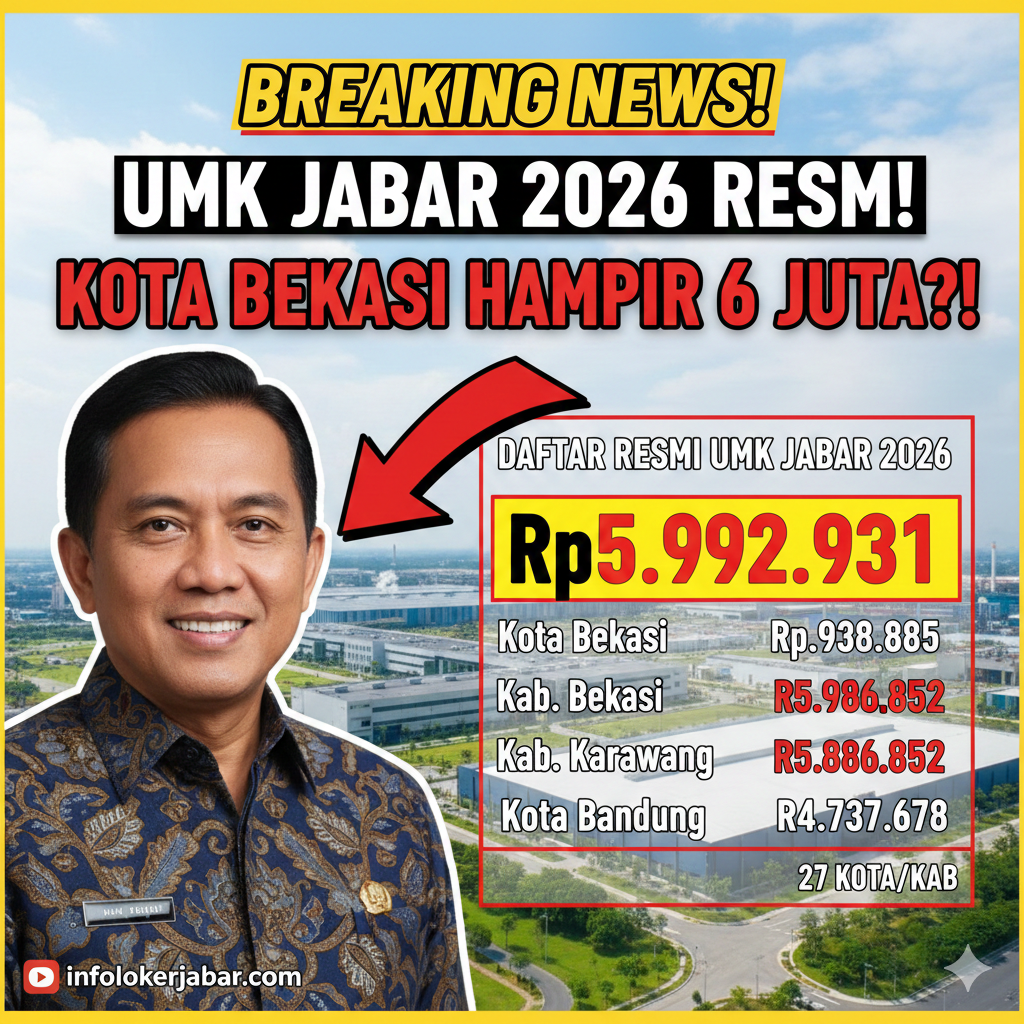 INFOLOKERJABAR.COM – Gubernur Jawa Barat, Dedi Mulyadi, resmi menetapkan Upah Minimum Provinsi (UMP) Jawa Barat tahun 2026 sebesar Rp2.317.601 pada Rabu (24/12/2025). Kenaikan sebesar 5,77% ini menjadi angin segar sekaligus…